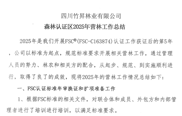 四川竹昇林业有限公司森林认证区营林工作总结